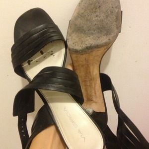 Black leather sandals with straps that cross cross around the ankle. 2.5" heel. Soles show signs of wear, but leather is in great condition! Very chic, easy to walk in. Size 8M.