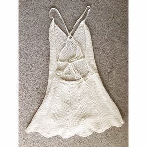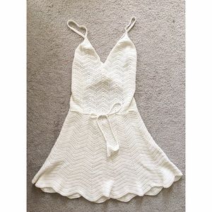 This scalloped knit dress is made of a heavy weight material that isn't see through. Can be worn as a summer dress or a swim cover up. I purchased it for my honeymoon and never got a chance to wear it because it was so cold the week we vacationed! It's a size medium, but because it's knit it does have some give. The tie in the back allows you to tighten if need be. This is more of an eggshell white.