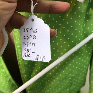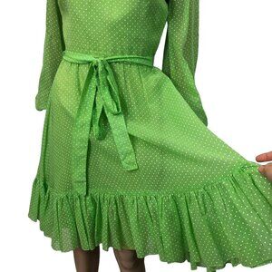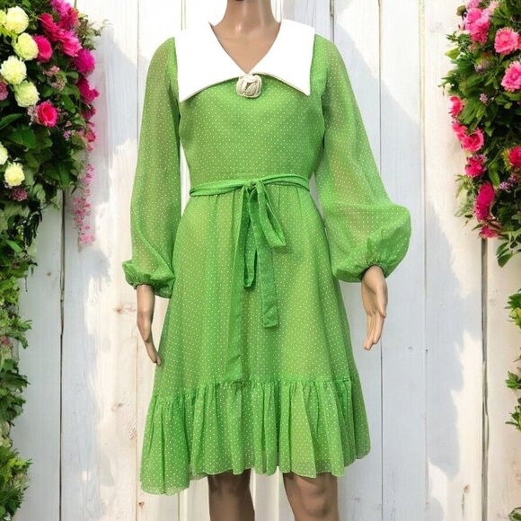 Fabulous vintage 1960s gem from notable and collectible Label Lilli Diamond of California. Lime green and white micro polka dot pattern. Large statement collar. Semi sheer balloon sleeves. Matching waist sash, lightly ruffled hem. Good vintage condition. A few mild signs of wear. A loose seam here, a tiny spot there. Only notable mark is on the lining and cannot be seen from the outside. This label ended in 1965 so can be dated to early 60s