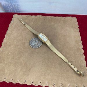 Vintage 1980's Hamilton Watch Quartz Movement Case is 10K Yellow Gold Rolled White dial 7 inch Narrow Mesh Bracelet 7/8 x 3/8 inch case Black and Gold Hands and Accents H Crown 10K Gold Filled. Stainless Steel Back, Crystal has very light scuffs. This Hamilton watch works it keeps time and is in better than good condition. 7 inch 10 Karat Rolled 1/20 Gold Mesh style strap or Band marked 892061
