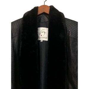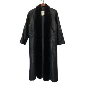 Vintage 90s Black Genuine Leather Snake Alligator Skin Faux Fur Trim Trench Coat M.
