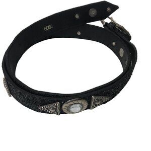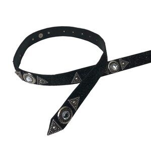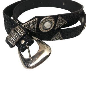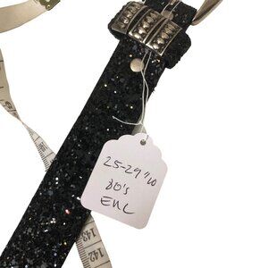 Great Greenville! Totally 1980s! Black glitter Silver metal hardware, and large, clear gemstone embellishments. Very glitzy and glamorous, but could also be western or glam rock. Labeled size small. Fits 25 to 29 inch waist