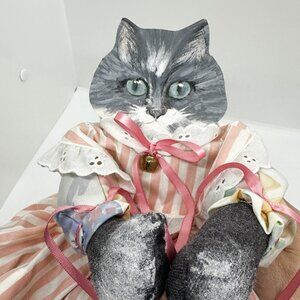 This is a one-of-a-kind handmade cat doll. Hand painted wood head, fabric stuffed limbs, custom made outfit. Hands are connected. About 15" tall with tail x 11" wide. No damage, light wear for age. Comes with wings/halo that do have damage and have fallen off over the years (due to glue).Weighs about 11oz.