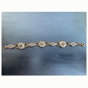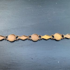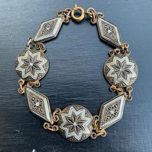 This is a beautiful vintage Damascene bracelet with linked medallions. The medallions have a very cool star burst design. The metal is copper with a great patina. From end to end, it is 7 1/2 in. long. Each medallion is a little over 1/2 in. around. It is in great vintage condition.