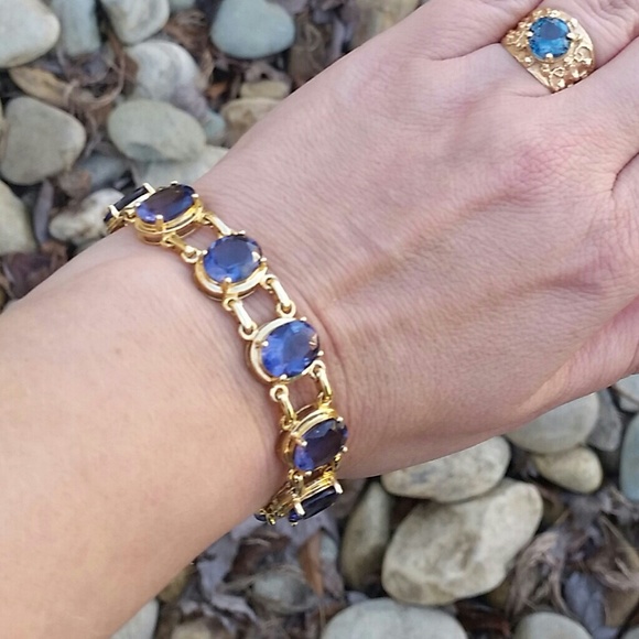 SOLD This bracelet could have walked right off the set of Dallas. It features 10 large faceted iolite ovals which face up at close to 3 carats each. It's is a very substantial bracelet, crafted in sterling 925 silver with heavy 18k gold overlay with safety catch. There is absolutely no fading or wear to the gold and it looks new. I have a 5.5" wrist and it's not too big. It has the look of tanzanite without the hefty price. Treat yourself! You deserve it!