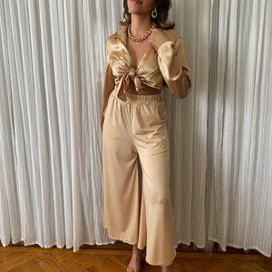 - Features: stretchy waist, high rise, wide leg, two side pockets; may be homemade.