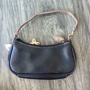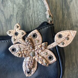 Vintage mini black shoulder bag with flower detail. She’s a cutie! She is about as long as my hand. Could fit some credit cards your keys and a lip gloss.
