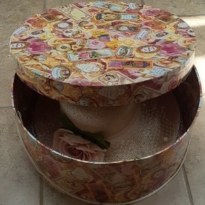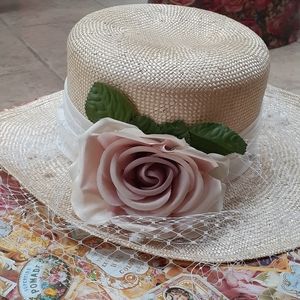 ๐ ๐Gorgeous, chic, classic straw hat. Like new condition. Pale pink and cream flower with greenery. Cream white ribbon and veil with polka dot fluffs. Perfect for a Sunday church service and brunch.