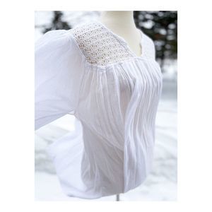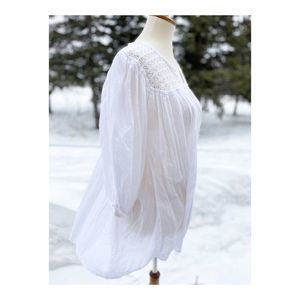 No size, brand or fabric tags. 100% Cotton. Crotchet details to collar. Wrist or 3/4 length balloon sleeves. Fabric is thin and fairly sheer, the voluminous pleats hide the sheer factor somewhat. Would fit a range of sizes. Displayed for photos on a S/M/L mannequin.