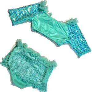 Vintage 60s dance costume by Costume Gallery. Soft stretchy jersey with iridescent sequin wave patterns, sheer tulle ruffle, extra long fringe, and pink bow accents. Super rare! Incredible condition, ready to see the stage again. No flaws. I make the iridescent fringe earrings in the model pic. They're $30 for one pair, and $50 for two, cut to your desired length - DM for pics and to arrange, if interested.