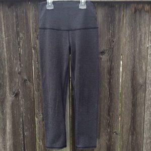 Heathered black. High wasted. Logo on the left calf. Super soft and very flattering! No issues. Needed and got a different size so letting these go. Cheaper on merc!