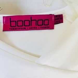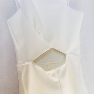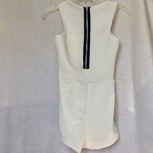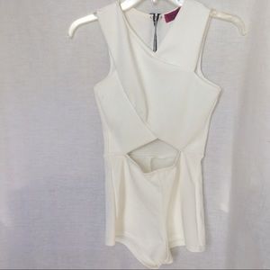 Brand- BooHoo. Size- 0. White romper with stomach cut out. Black zipper on back of romper as shown in photo. Great condition, worn once!