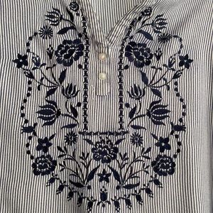 Natural Reflections womens 3/4 sleeve blouse with embroidered detail, blue & white vertical stripes, size medium but fits like a small/medium.