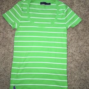Brand New Never worn Polo Crew Neck Green and White Stripe Shirt with Purple Horse. Medium Slim Fit
