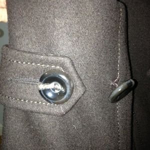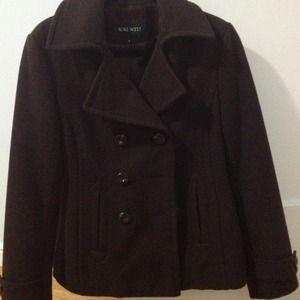 Nine West wool peacoat lined with slit front pockets and button detail on sleeve. Well loved but still has a lot of life left. One button on sleeve needs to be reinforced as seen in last photo.