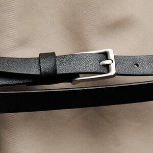Full cut lapel collar trench coat. Long sleeves with buttoned tabs. Front welt pockets. Contrasting belt with buckle. Front button closure.