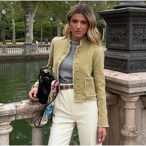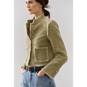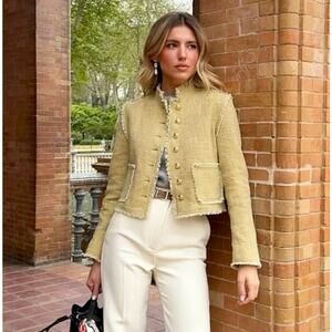 Light khaki jacket made of 100% cotton. Round neck and long sleeves with buttoned vents. Front patch pockets. Textured fabric detail. Frayed trim. Front metal button closure. From ZARA, in size M. New with tags. Sold out in stores.