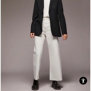 Off white high waisted jeans with back patch pockets, unfinished / distressed hem, front zipper, and front closure with pretty marble button