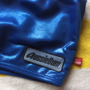 *SOLD!* Worn for 10 minutes for a photo shoot on an inflatable dolphin (ha!), this aussieBum swimsuit is fully lined, features an aussieBum patch on the left side and is a shiny, metallic SAPPHIRE BLUE! Part of the brand's "Shine" collection, it's no longer made. Sides measure 5.75" wide. Drawstring was removed for a smoother finish in photos (a dry cleaner can add one if you wish). This must be gently soaked and hand washed if exposed to chlorine/salt water. Size LARGE (34-36 waist).