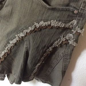 Excellent condition. smoke free home. fringe raw edges. flare triangle fabric pieces. denim jeans fabric with lots of stretch. silver tone studs. Belt loops and pockets.