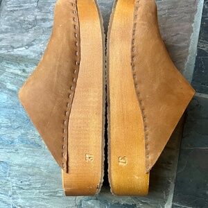 Excellent condition, worn a handful of times. Platform is 2”, heel 1.5”. Some small chips to wood, not noticeable when wearing. Leather is in perfect condition. I just prefer a taller platform! idk the color name, it was a special order, it's a gorgeous, warm toffee brown. Wood is same color.
