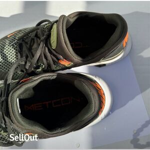 Keywords: Nike Metcon, athletic shoes, men's sneakers, cross-training, running shoes, sage green, cushioned, breathable, durable, lace-up, mesh upper, rubber outsole, activewear, pre-owned, comfortable.