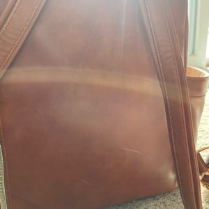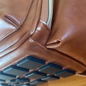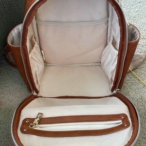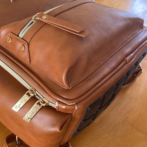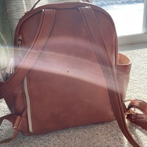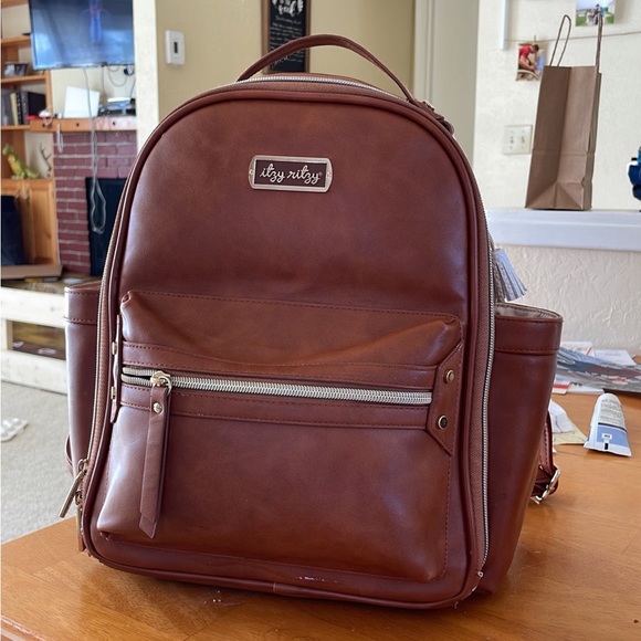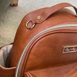 Itsy, ritzy, mini diaper bag in good condition!  There’s lots of life left in it, just needing a bigger, one for travel. There is a faint mark on the back in the picture shown and some peeling on bottom edges but not super noticeable until flipped over. Comes with leather changing pad! Color:cognac Let me know if you have any questions.
