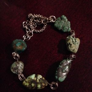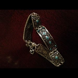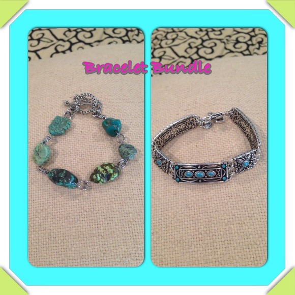 Two turquoise bracelets. One with turquoise stones and silver clasp (not Brighton). Another with silver and black rectangles and turquoise accents (Brighton).