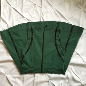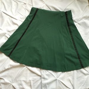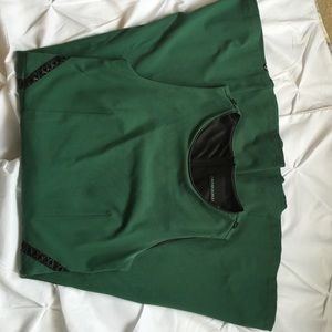 Gorgeous hunter green dress with leather detailing along the front and back. Exposed black zipper and fully lined. Fit and flare design so it's nice and snug on top and flows from the hip. Got so mane compliments when I wore this number! Body of the dress is 85% nylon and 15% spandex. Lining is 100% polyester. 19 inches from the waist down, bust is 16 inches pit to pit.