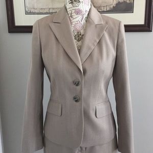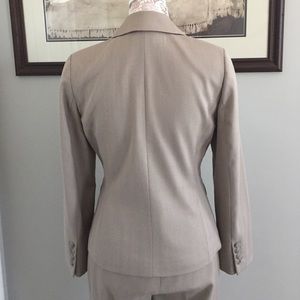 EUC! This Ann Taylor 2 piece pant suit is fully lined. Jacket is a 2 button closure with pockets on both sides. Pants have a button and 2 hook closure with zipper. Pants are regular length, measure 41.5" from waist to bottom of pant leg. Jacket is a petite and arms measure 23" from top to bottom. Color is a grayish tan. Great buy!
