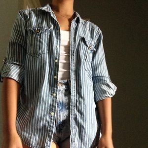 100% cotton. Good condition. Sleeves can be rolled or not rolled and all buttons are working. The buttons do not show when buttoning the top to close it.