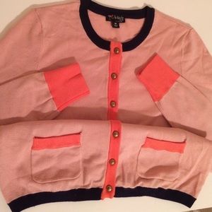 The Webster Miami for target size medium cardigan. This adorable cardigan has the perfect color balance of the classic pale pink and navy with s pop or bright pink trim on the sleeves and buttons. Distressed bronze buttons give this sweater a upscale feel. 70% rayon 30% nylon super soft. Only worn twice in great condition.