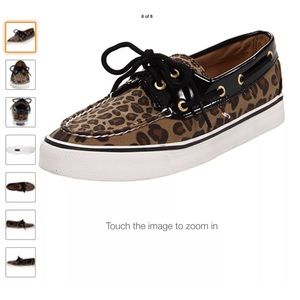 Gently worn, women's size 7 boat shoes by Sperry. Lovely contrast between canvas leopard print and black shiny patent. Shoes come with original laces, and are in very good condition.