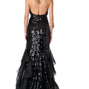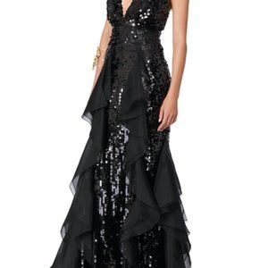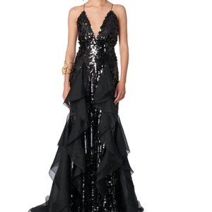 From the Resort 2022 Collection. Form-fitting sequin-embellished gown with silk organza ruffle detailing at skirt.