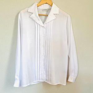 Crisp pristine white blouse vintage circa 90s by Claudia Richard with elongating front vertical pleats and a lovely embroidered notched collar. Buttons down the front and at wrists. Classic minimalist aesthetic, cottagecore, grannycore, timeless.