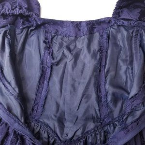 Vintage 1980s/1990s handmade navy brocade Renaissance dress. tea length, basque waistline, leg of mutton shoulders. covered zipper back closure. no pockets. elastic in shoulders. plastic boning in sides. fully lined. Fabric has no stretch. Excellent vintage condition.