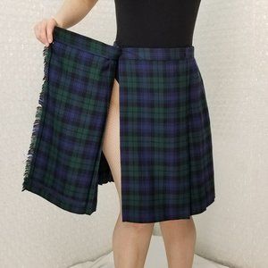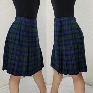Vintage 1980s/1990s Talbots Petites blue/green tartan pleated kilt. wrap style with button & hook front closure. fabric has no stretch. No pockets. a few tiny moth holes, not noticeable when worn.