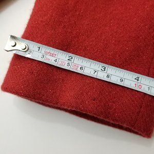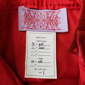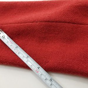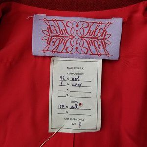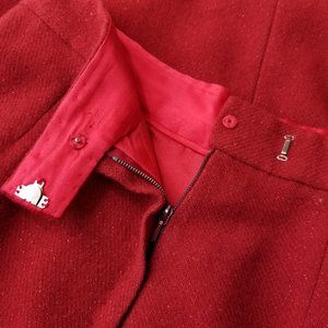 Vintage 1990s Tuleh red sparkly wool blazer & skirt suit. skirt has covered zipper side closure. blazer has 4 button front closure. no pockets. no stretch. blazer & skirt are fully lined in red silk. tag coming loose on blazer, otherwise Excellent vintage condition!