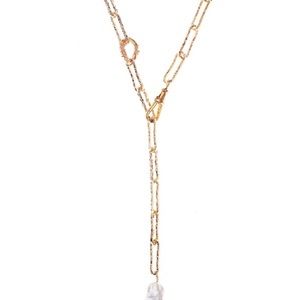 The model is wearing it with the pearl dropping straight in the middle. But i used to wear with the pearl towards the left or right side so the shape of the necklace is rounder.