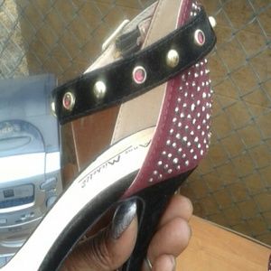 Black &burgundy Suede w/ studs across the top an back. Ankle straps w/ gold an burgundy studs an gold buckle. 4 to 5 inc heel. Whore two times but still in good condition.
