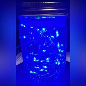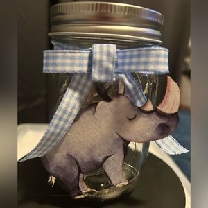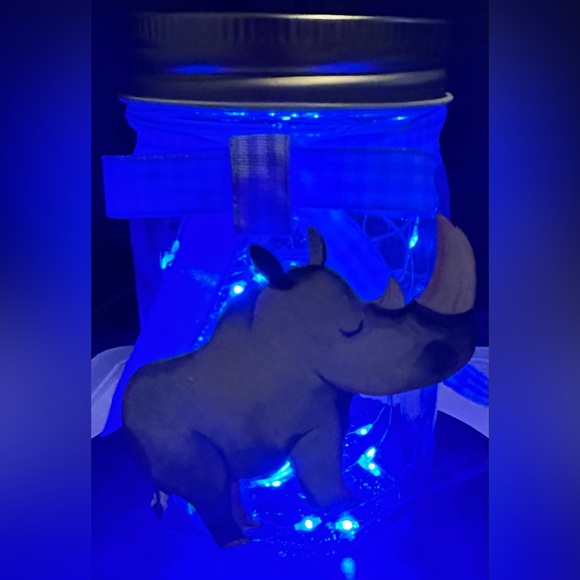 ❌SOLD❌BABY RHINO WOODEN CUT-OUT DECOR MASON JAR W/ BLUE LED FAIRY-LIGHTS & BABY BLUE BOW/HANDMADE BY ME! This 12oz mason jar is filled with 7 feet of LED blue fairy-lights. A high quality wooden cut-out of a rhinoceros adorns one side of the jar. Lastly a light blue plaid handmade bow adds a finishing touch to the front of this piece. Battery ready! Each piece of mine is one-of-a-kind. Some can be closely replicated. I accept custom requests with advanced payment of a variety of arts and crafts. Please reference the marked “SOLD” section in my closet for several examples. All created and kept stored in a clean, smoke-free and air-conditioned home.