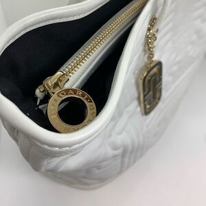 BVLGARI White Leather Double Top Handle Hand Bag -Quilted Leather Hand Bag by BVGARI -Open and Close Tote with a Top Hook -Hook Engraved with BVLGARI Logo -3 Main Compartments -A Zippered Center Compartment -Interior Rear Zipper Pocket w/ Opposite Twin Slip Pockets Soft as Butter Leather :) -Double Top Handles -Contrasting Black Canvas Interior Lining -Gold Tone Engraved with LOGO—Metal Hardware Zipper Pull ~7" Strap Drop ~ 11" Length ~ 5" Width ~ 8.5" Made In Italy ~ Retail $$$$