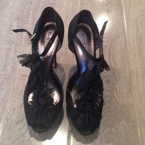 ❤️BeBe black satin lace Pumps❤️ Size 7 with a 5" heel and 1" platform. Great condition only worn 3 times. Bundle for a bigger discount!✨👌