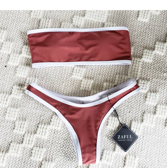 Includes both top and bottoms. Never worn. I ordered a size too small. Size small and fits true to size. Good thick material and gorgeous color true to pictures. Bottoms are cheeky but not a thong.