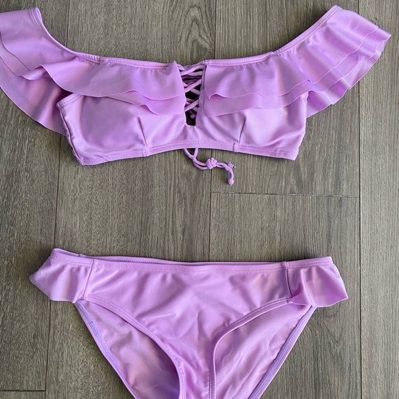 Lavender ruffle arm and bikini bottom designed bikini. Never worn. Pet free & Smoke Free home