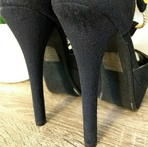 Rare super sexy Black faux suede open-toe 5" heels featuring a unique gold-braided double ankle T-Strap for an ultimate sexy look. Excellent condition. Worn twice only. Original box and packaging included. Priced to sell.