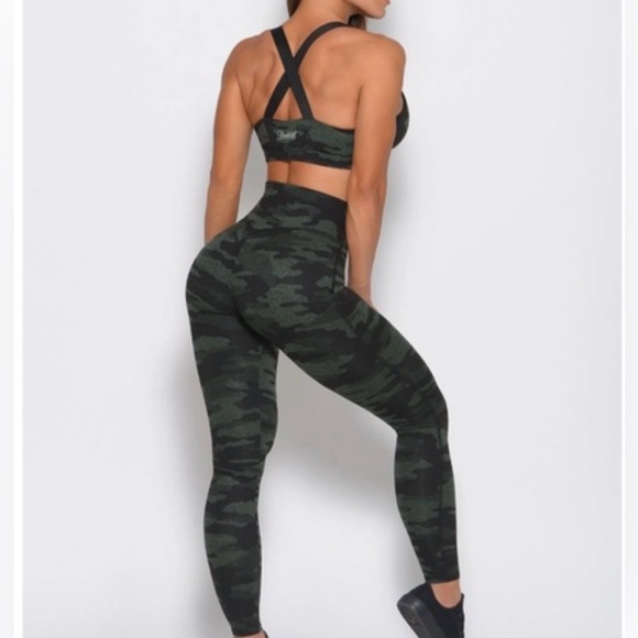 Bombshell set in GUC. These are the fit leggings, scrunch butt, no front seam and no side pockets, size M. Bra is an XL,does not come with padding but can add if you need them. Green/black camo. Price is firm. Cross posted.