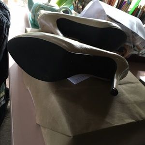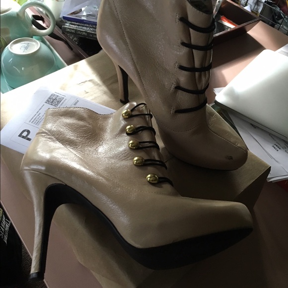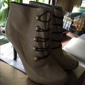Cream color leather upper military style booties! I love these but must part with them😔 my loss is your gain! These slip the front is fastened by elastic bands and gold colored buttons!