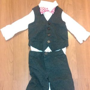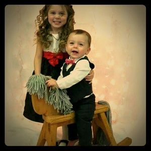 Worn once for Christmas photos. No stains. A few threads poking out now from washing but great condition. It include one white long sleeve button up onsie, vest, pants, and adorable bow tie. My beautiful children:) also have the dress seen in picture one. It's 5t and wore one time. Perfect condition. Lmk if interested