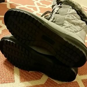 These boots are a pretty grey suede with black/brown faux fur cuff. they have zippered sides with laces up the front to tighten. These. Boots are perfect for ice and deep snow. These are brand new, never used! NWOT